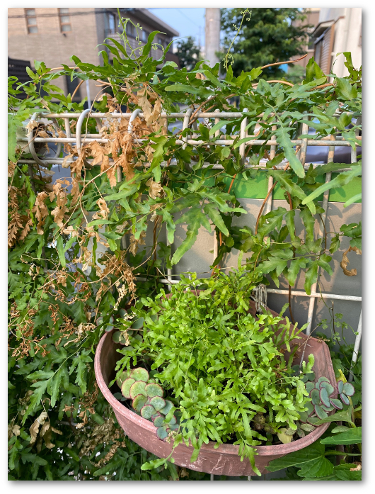 写真のフェンスの蔓は少し茂りすぎたので、むしったところが枯れている。