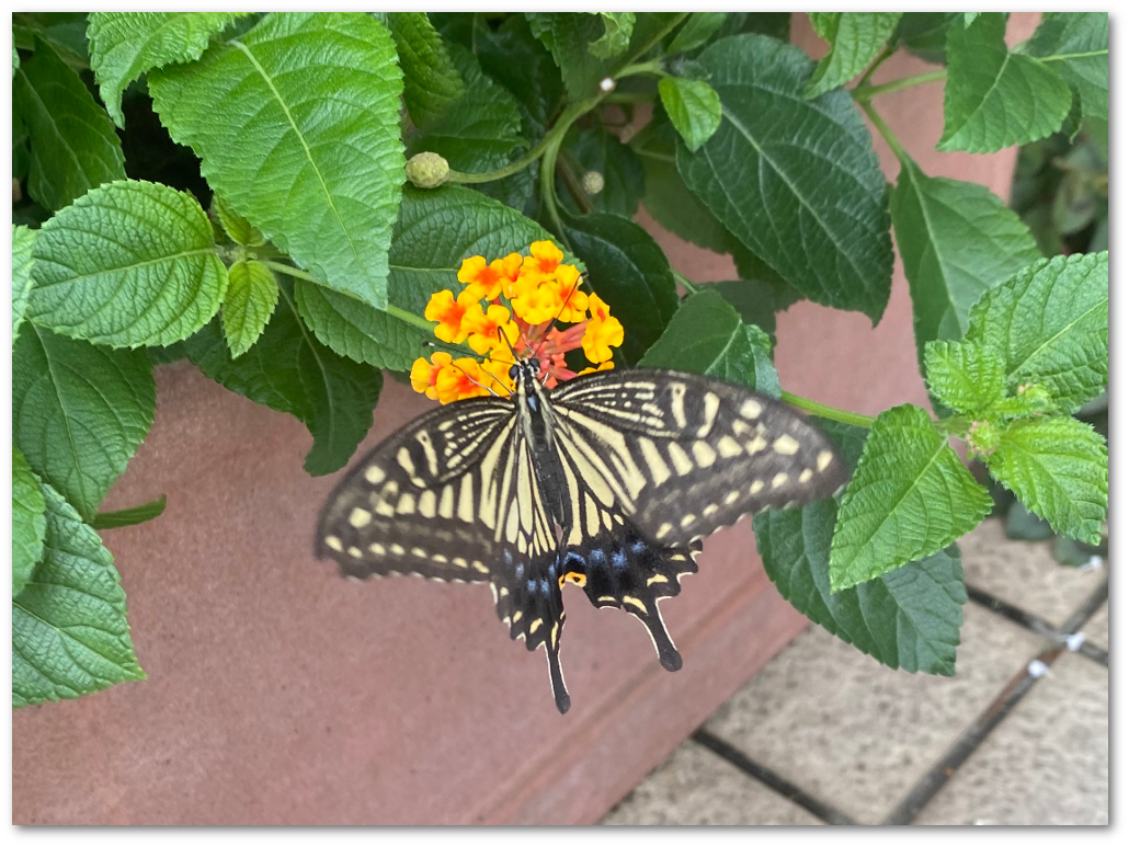 今日は珍しくアゲハチョウが目の前の七変化(ランタナ)にとまった。