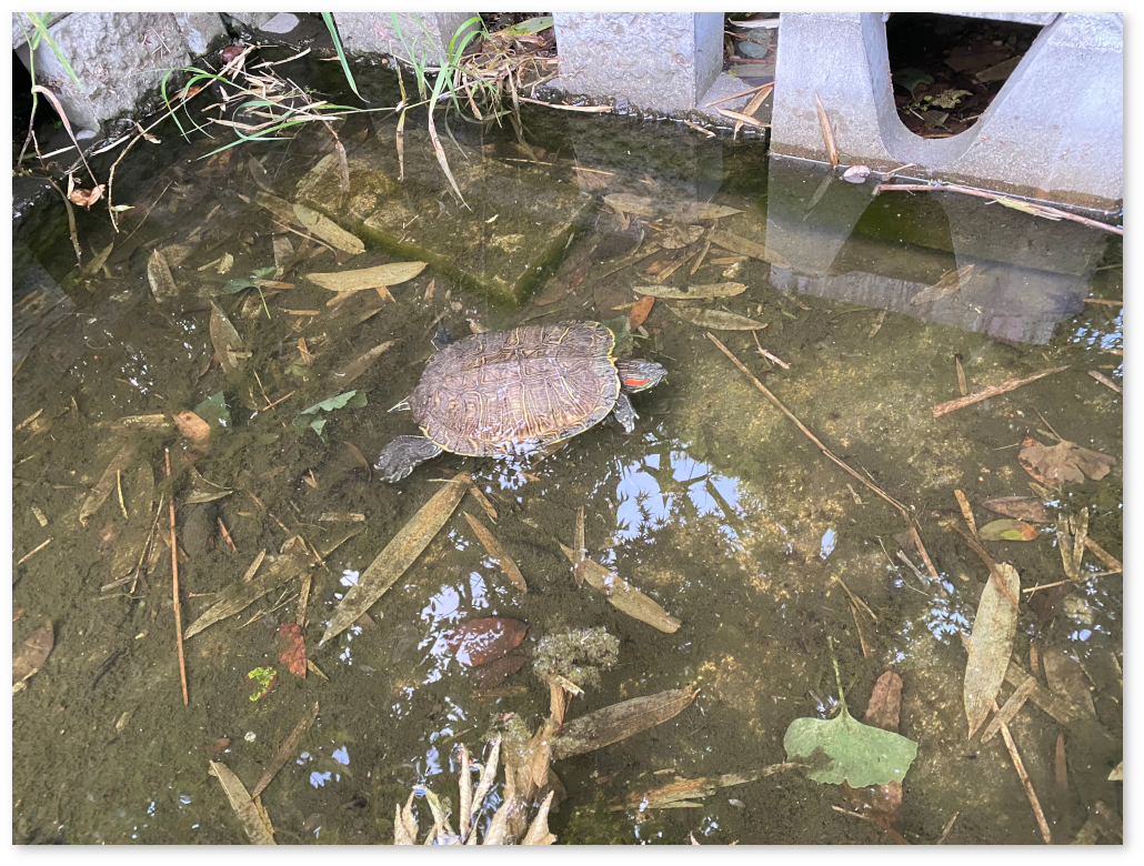 うまく水場を造ってあり、亀や魚もいる道。