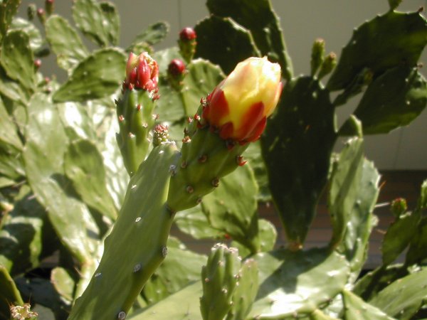 近所に四箇所あるウチワサボテン、多分ここのだけ開花するのは実がならないように花のあとを摘んでいたからだと思う。実ができてたらこの開花はないのではないかと推理します。