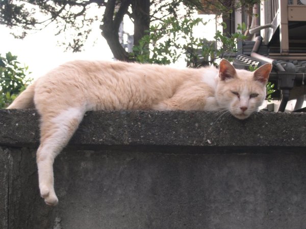 歩いていたら、ぴくぴくっと耳を動かしていました。のったりと、暑さに溶けてるネコです。